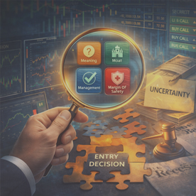 Investments must satisfy the 4M framework and explicit valuation criteria before capital is committed. Entry is typically executed via options rather than direct purchases, with deployment biased toward periods of uncertainty.
