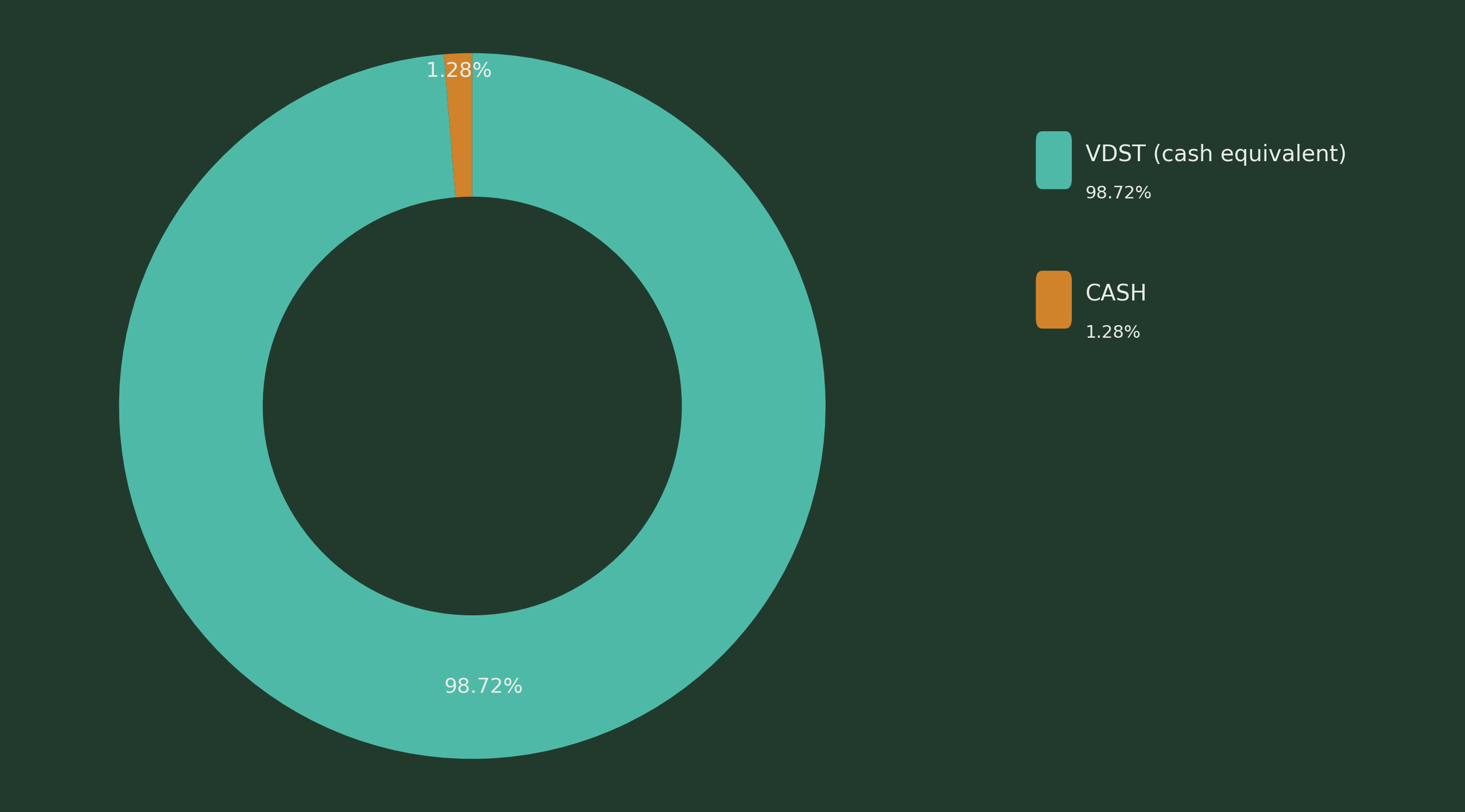 VDST (Vanguard U.S. Treasury 0-1 Year Bond UCITS ETF USD Accumulating) refers to a short-duration, investment-grade fixed income instrument used as a cash equivalent. It is held for liquidity management, capital staging, and optionality rather than return generation, and may temporarily represent a large share of the portfolio during periods of partial deployment.