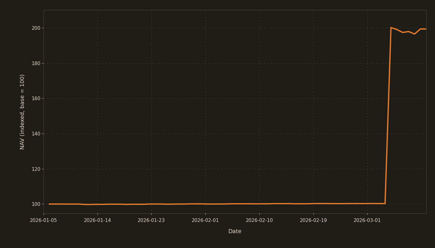 Indexed portfolio value since inception, including capital inflows and outflows. Values are normalized to 100 at the first meaningful capital deployment. The series reflects changes in total account value rather than investment performance.